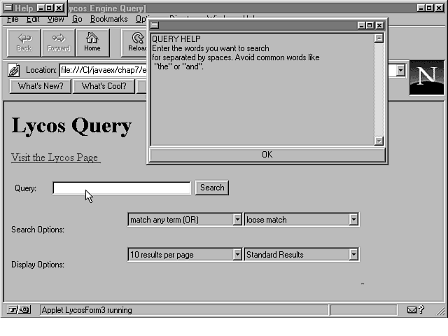 This applet is meant for demonstration purposes only. While it will function with the real Lycos server, it does not display the advertisements from the normal Lycos search page. Although you may consider this a plus, it really isn't. Advertisements keep companies like Lycos in business and allow them to provide these wonderful services to you at no cost. Please do not use this applet or any other program to thwart a company's advertising displays. It hurts everyone in the long run.